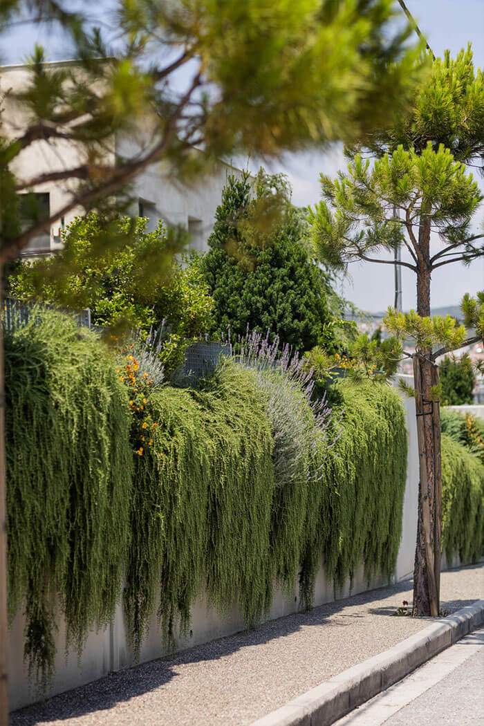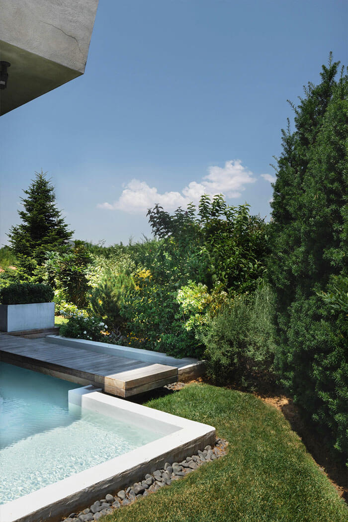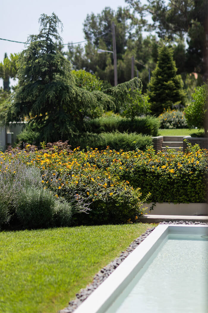 Σχεδιάσαμε έναν ενιαίο χώρο με γρασίδι, ώστε οι δύο οικογένειες να απολαμβάνουν κοινές στιγμές χαλάρωσης. Χρησιμοποιήσαμε γραμμικές φυτεύσεις, για να σηματοδοτήσουμε και να τονίσουμε τις αλλαγές στα επίπεδα. Επιπλέον, εμπλουτίσαμε την ποικιλομορφία του τοπίου με έναν γεωμετρικό μεσογειακό κήπο με ορθογώνιες επιφάνειες από χαλίκι, εμπνεόμενοι από τον αρχιτεκτονικό σχεδιασμό των κατοικιών. Εξασφαλίσαμε τη θέα των δύο σπιτιών και τον χειμώνα, δίνοντας έμφαση στο ύψος των φυτών που επιλέξαμε. Τοποθετήσαμε κυρίως κωνοφόρα φυτά που δημιουργούν χρωματικό και γεωμετρικό ενδιαφέρον τη χειμερινή περίοδο. Για να αυξήσουμε την αίσθηση ασφάλειας, αλλά και να ενισχύσουμε το σημείο έναντι των καιρικών συνθηκών, τοποθετήσαμε τα πιο ψηλά και ογκώδη φυτά περιμετρικά του κήπου. Ο κήπος των τεσσάρων εποχών ήταν έτοιμος να υποδεχτεί τις οικογένειες.